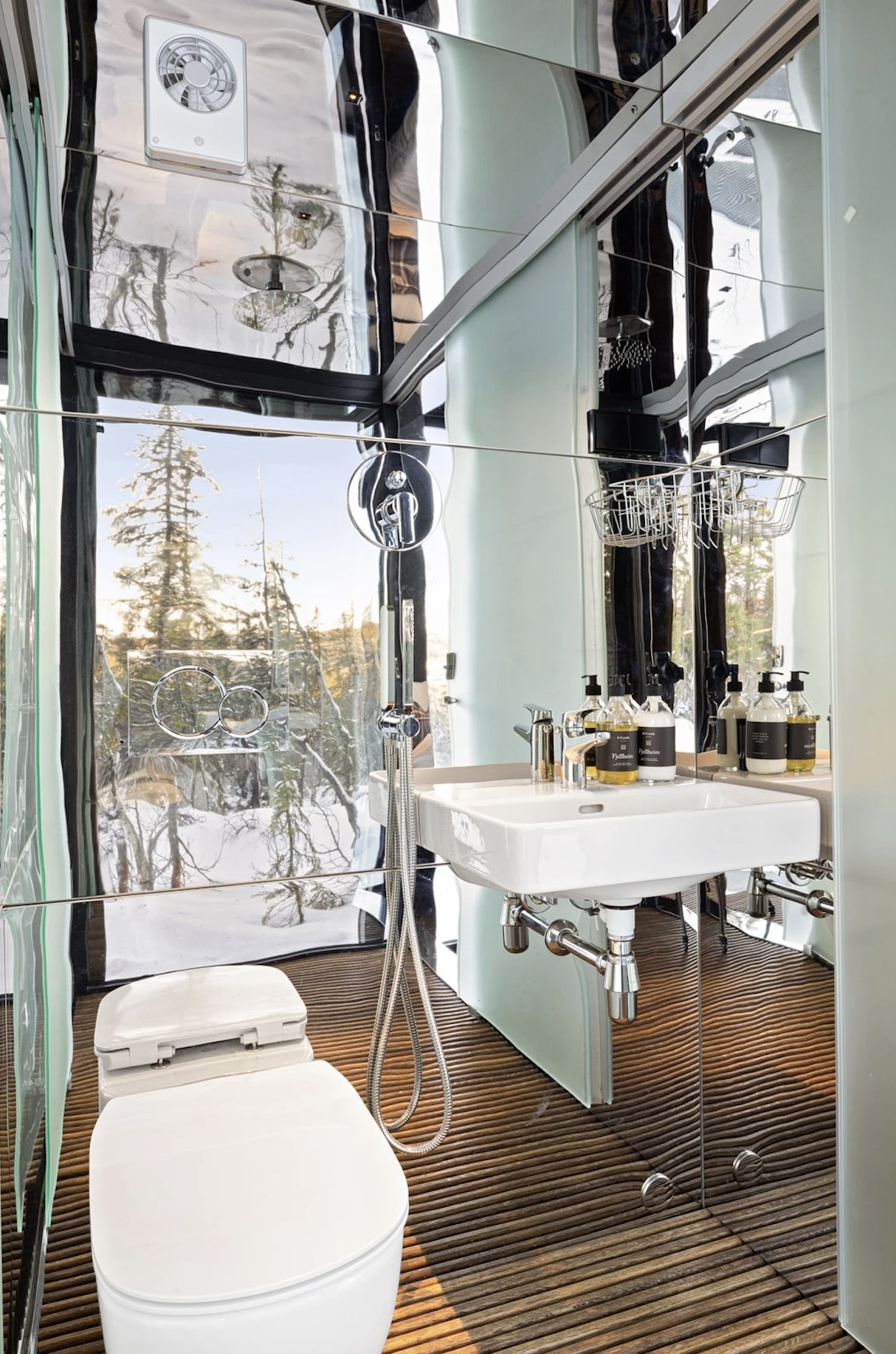 I badet er både vegger og tak i rustfritt stål og speil, noe som gir en romslig og annerledes oppleves. Gulv med varmekabler og spaltegulv av tre.